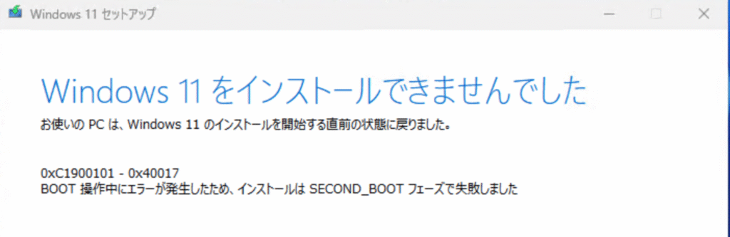 という手順で進めたところ1時間くらいで作業が終了、、、と思いきや、エラーが表示されてWindows 10に戻されるという。。。